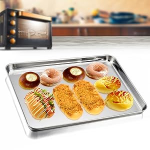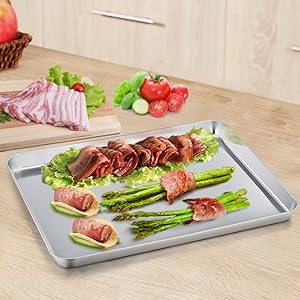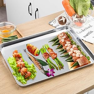 - √ HEALTHY MATERIAL - These baking trays are made of high quality 18/0 stainless steel without toxic chemical coating; Rust proof and sturdy material make these trays perfect for everyday use